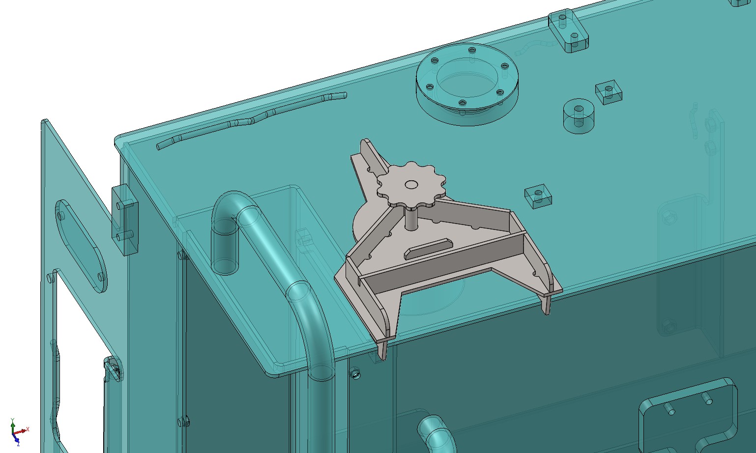 The tank filler neck needs to be orientated exactly to ensure the customers logo is rotated correctly once the cap is installed. Jig J233 locks the filler neck in the correct position, at the correct height and square to the surface of the tank. It uses the filler necks cap locking geometry to lock the filler neck to the jig in the correct orientation. The use of this clever jig means there is no requirement for any operator measuring or alignment. The design of the laser cut parts ensures that when the jig is assembled every part is perfectly square.